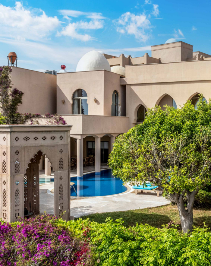 Внутри — резная мебель, светильники в виде свечей и декор из Марокко. Снаружи — каскадные бассейны и сады, достойные султанов